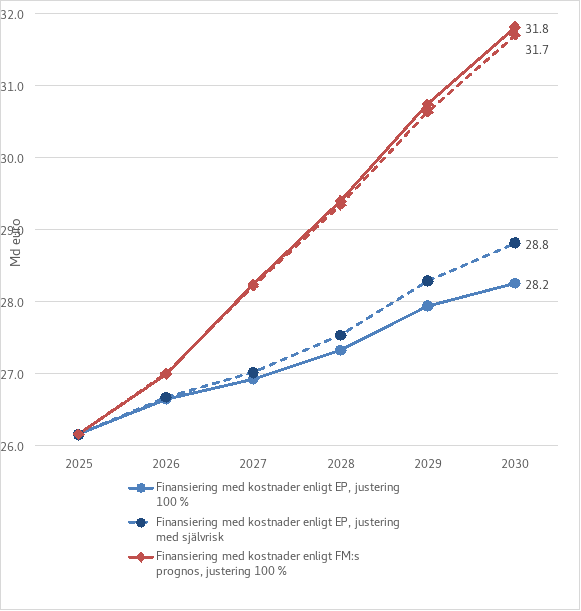 I figur 1 nedan beskrivs nivån på välfärdsområdenas finansiering på riksnivå och hur självrisken påverkar den om kostnaderna utvecklas enligt välfärdsområdenas ekonomiplaner respektive finansministeriets prognos som beskrivs ovan och närmare i propositionens avsnitt 4.2.1.2.