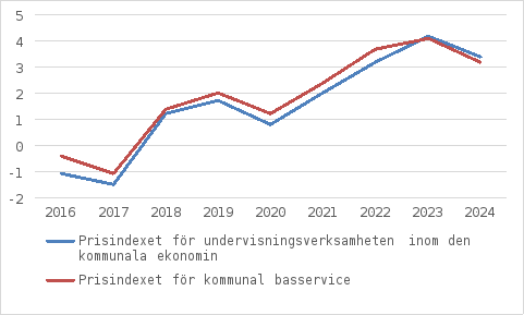 Åren 2016–2022 var förändringen hos prisindexet för kommunal basservice i genomsnitt 1,3 % per år och förändringen hos prisindexet för undervisningsverksamheten inom den kommunala ekonomin i genomsnitt 0,9 % per år. Den snabbare kostnadsutvecklingen inom social- och hälsovårdsverksamheten jämfört med undervisningsverksamheten ökade således årsförändringen hos prisindexet för kommunal basservice till en nivå som var i genomsnitt 0,4 procentenheter högre än årsförändringen hos prisindexet för undervisningsverksamheten under granskningsperioden. Åren 2023–2024 minskade skillnaden i indexens årsförändring till i genomsnitt 0,15 procentenheter, eftersom årsförändringen i prisindexet för kommunal basservice var 4,1 respektive 3,2 % och årsförändringen i prisindexet för undervisningsverksamheten inom den kommunala ekonomin 4,2 respektive 3,4 %. Utvecklingen av indexens årsförändringar åskådliggörs i figur 1.