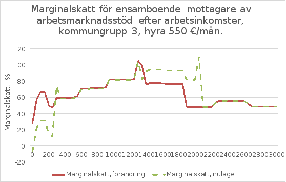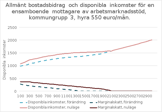 Av bild 10 framgår hur ändringarna påverkar de disponibla inkomsterna och bidragsbeloppet på olika inkomstnivåer. Diagrammet presenterar ett kalkylerat exempel som bygger på årliga genomsnittsinkomster, och det ska inte uppfattas som en representativ beskrivning av exakta effekter i euro i verkliga situationer. Det allmänna bostadsbidraget justeras endast en gång om året, såvida det inte sker en betydande förändring i inkomsterna, och beskattningen beräknas på årsnivå. Detta innebär att inkomsternas inverkan på förmånerna i praktiken inte är lika linjär som diagrammet visar. Bilden illustrerar ändå hur bidragsnivån kommer att förändras minst personer som helt saknar jobb och arbetsinkomster. Den största förändringen kommer att ske när arbetsinkomster ligger på omkring 900–1 400 euro. Är inkomsterna lägre än så kommer utkomststödet att kompensera för ett sänkt allmänt bostadsbidrag, medan inget bostadsbidrag kommer att betalas ut vid inkomster som överstiger 1 4000 euro. I dagsläget får personen i exemplet allmänt bostadsbidrag även med månatliga arbetsinkomster som överstiger 2 000 euro, men i och med ändringen upphör bidraget redan med arbetsinkomster på cirka 1 400 euro. Kalkylerna har gjorts på 2023 års nivå och utifrån lagstiftningen 2023.