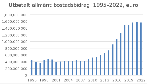 Knappt 15 000 hushåll fick allmänt bostadsbidrag för ägarbostad i slutet av 2022. Detta är 3,9 procent av alla hushåll som fick bidrag, även om antalet ökat relativt snabbt sannolikt till följd av att räntenivån stigit. I augusti 2023 betalades bidrag ut redan till 17 000 sådana hushåll. Två tredjedelar av bidraget gällde aktielägenheter och en tredjedel egnahemshus. I genomsnitt uppgick bidraget i slutet av 2022 till cirka 190 euro i månaden för boendeutgifter på omkring 362 euro. I augusti 2023 hade det genomsnittliga bidraget stigit till cirka 242 euro i månaden och de genomsnittliga boendeutgifterna hos bidragstagarna till 513 euro i månaden. Med dagens räntenivå kommer det slopade bostadsbidraget således att dra in ett bidrag på i genomsnitt cirka 240 euro i månaden för omkring 17 000 bidragstagare. Om de stigande trenderna för boendeutgifterna och antalet bidragstagare fortsätter kommer effekten sannolikt att vara något större 2024.