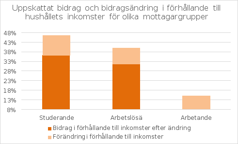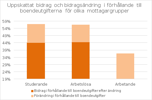 Bild 9 beskriver den bidragsändring som de föreslagna ändringarna medför i förhållande till bidragstagarens inkomster i olika bidragstagande grupper. Trots att bidragsbeloppen förändras mest för arbetande hushåll har bostadsbidraget där en mycket mindre roll i förhållande till hushållets inkomster. Därför blir förändringen sett i relation till inkomsterna är inte större för de hushållen än för andra grupper.