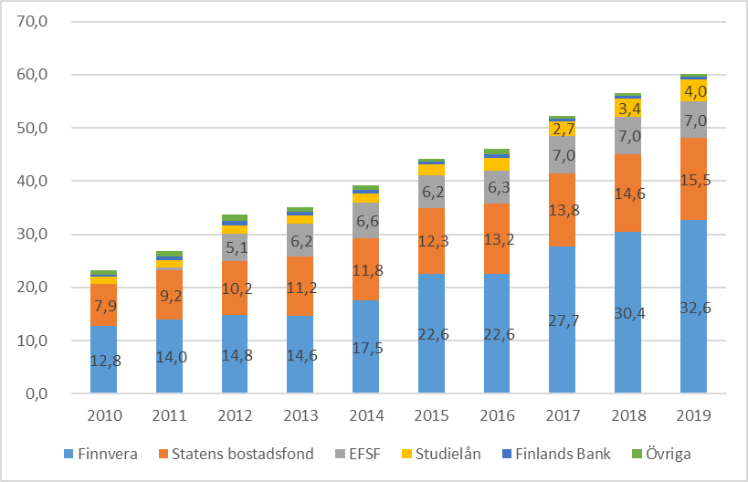 Statens borgens- och garantiansvar utgör en egen osäkerhet när det gäller utvecklingen av statsskulden och statens behov av medelsanskaffning. Om staten skulle stå för dessa ansvarsförbindelser, skulle detta potentiellt öka behovet av statens upplåning. När det gäller exportfinansiering har man förberett sig på en realisering av borgens- och garantiansvaret med två fonder. Finnvera Abp:s fond för exportgaranti- och specialborgensverksamhet uppgår till ca 770 miljoner euro. I statsgarantifonden finns medel om cirka 680 miljoner euro. Statsgarantifondens medel har dock inte i egentlig mening placerats separat, utan de finns på fondens samlingskonto vid statskontoret, dvs. som kortfristiga fordringar på statens budgetekonomi. Att använda statsgarantifonden ökar således i praktiken mycket sannolikt också behovet av statens medelsanskaffning, eftersom fondens medel inte utgör öronmärkta särskilda tillgångar i statens gemensamma kassa. En fond på 266 miljoner euro fungerar som en buffert för riskerna i Finnveras inhemska verksamhet. Statens borgens- och garantiansvar har ökat betydligt under de senaste tio åren (figur 2). Medan ansvarsbeloppet ännu 2010 var cirka 23 miljarder euro, översteg det i slutet av förra året gränsen på 60 miljarder euro. De största ansvarsförbindelserna hänför sig till exportfinansiering och bostadsfinansiering. I fråga om dessa har också ökningen av ansvarsförbindelserna varit kraftigast.