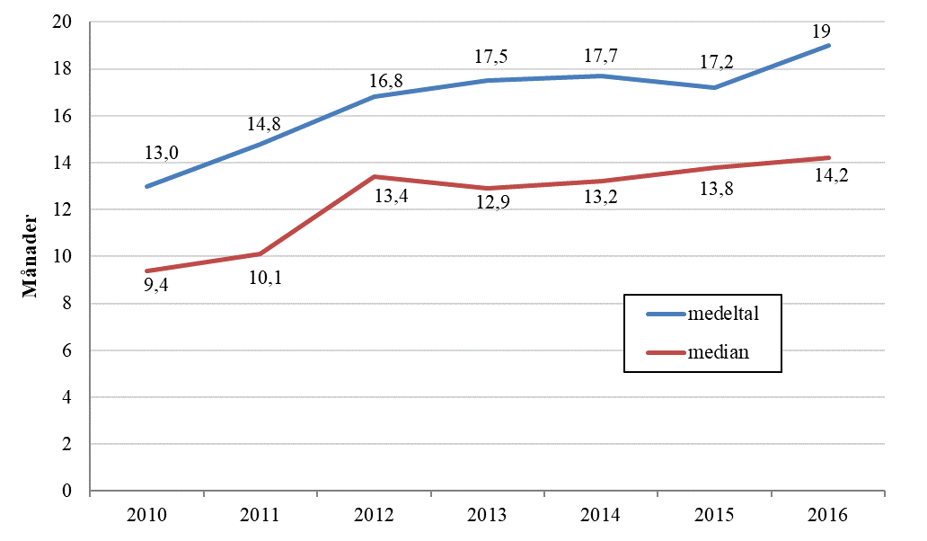 I praktiken har handläggningstiderna för de ansökningar om miljötillstånd som regionförvaltningsverken handlägger förlängts under verkens hela existens från början av 2010. I diagram 1 presenteras medeltalen och medianvärdena för handläggningstiden för ansökningar om miljötillstånd i samband med regionförvaltningsverkens beslut om tillstånd enligt miljöskyddslagen 2010—2016.