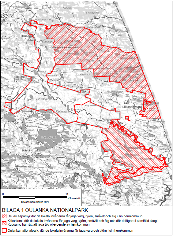 I propositionen föreslås det att de områdesspecifika bestämmelserna om jakt i huvudsak förblir oförändrade. Jakträtterna har i propositionen i huvudsak bibehållits som de är utan att de utvidgas eller utan att de begränsas mer än i nuläget. I Oulanka nationalpark utvidgas dock området för älgjakt något för att förtydliga bestämmelsen. Det föreslås att älgdrev i enlighet med nuläget inte tillåts i Noux och Koli nationalparker på grund av det stora antalet besökare i områdena. Med stöd av 51 § 1 mom. 3 punkten i den nya naturvårdslagen kan Forststyrelsen dock bevilja tillstånd för att avlägsna älg och vitsvanshjort i Noux och Koli nationalpark, om det behövs för att avvärja skador som dessa orsakar i trafiken. Dessutom föreslås det att undantaget som tillåter ripfångst med snara i Sompio naturreservat i Sodankylä slopas, eftersom ripfångst med snara enligt jaktlagstiftningen endast tillåts i Enontekis, Enare och Utsjoki kommuner.