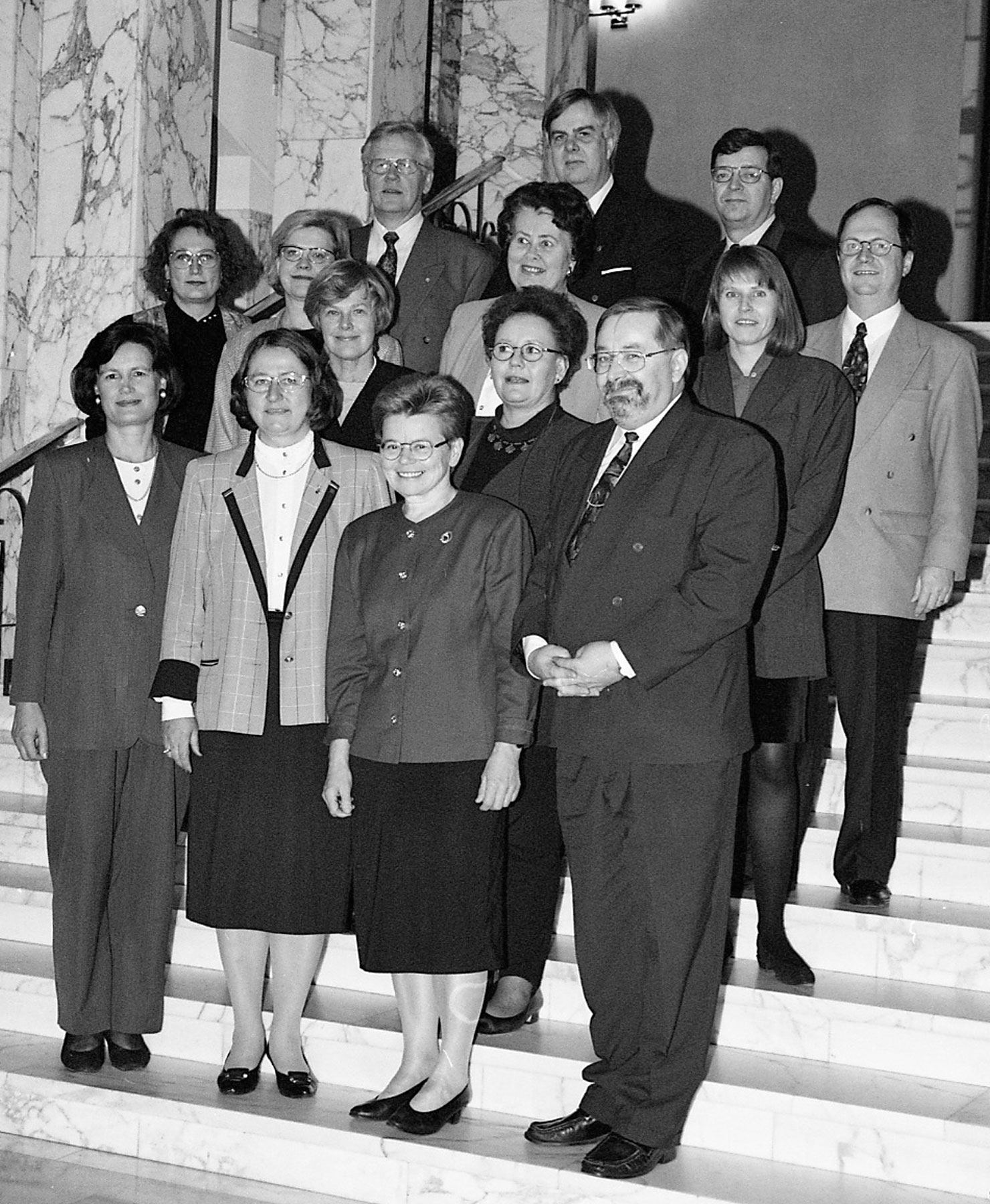 De första finländska ledamöterna i Europaparlamentet valdes av riksdagen i början av 1995, eftersom Finland inte hann delta i valet till Europaparlamentet 1994. Grupporträtt av ledamöterna i Riksdagshusets marmortrappa.