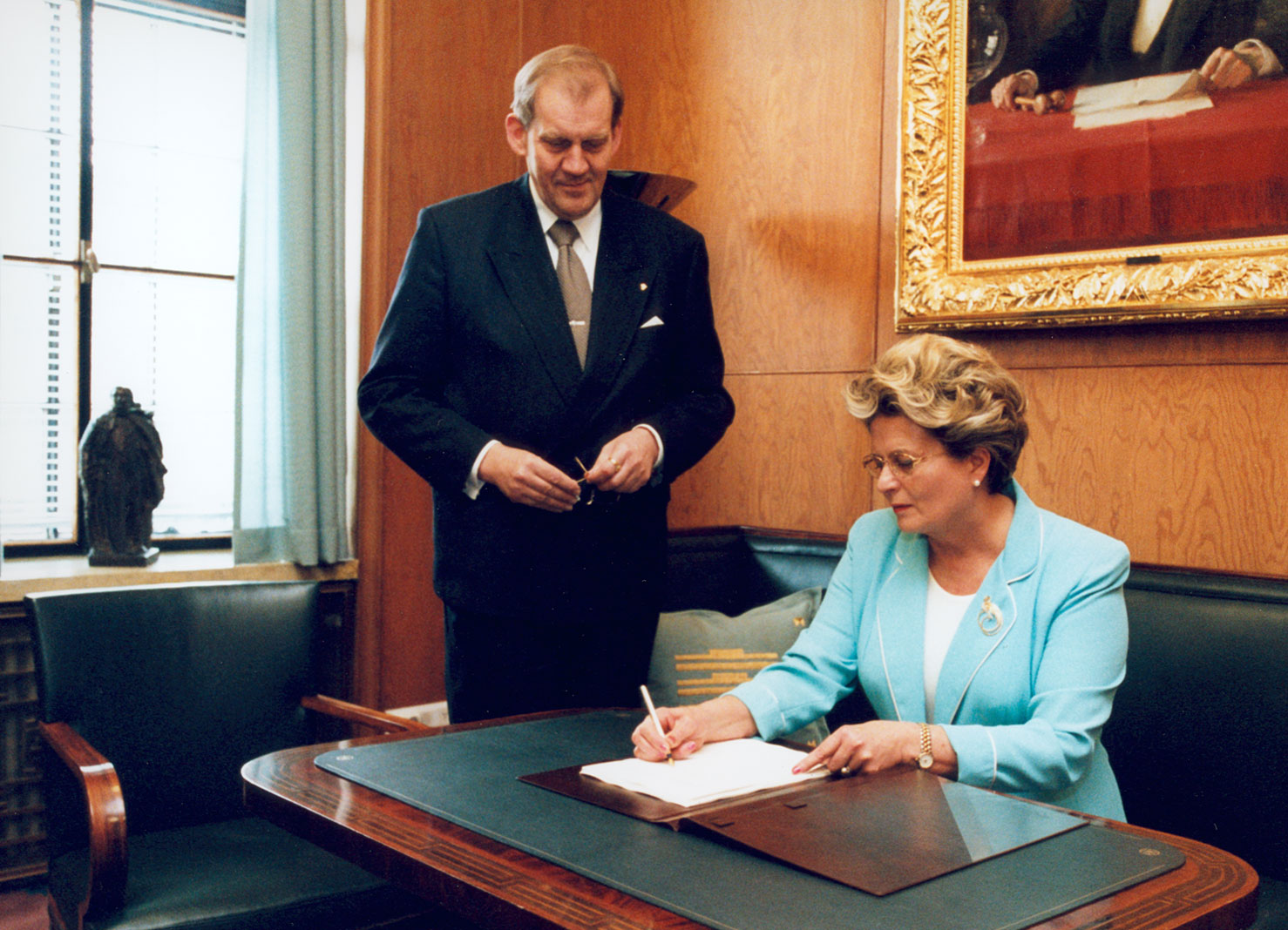 Talman Riitta Uosukainen undertecknar riksdagens svar till regeringen efter att riksdagen godkänt den nya grundlagen. Bredvid generalsekreterare Seppo Tiitinen.
