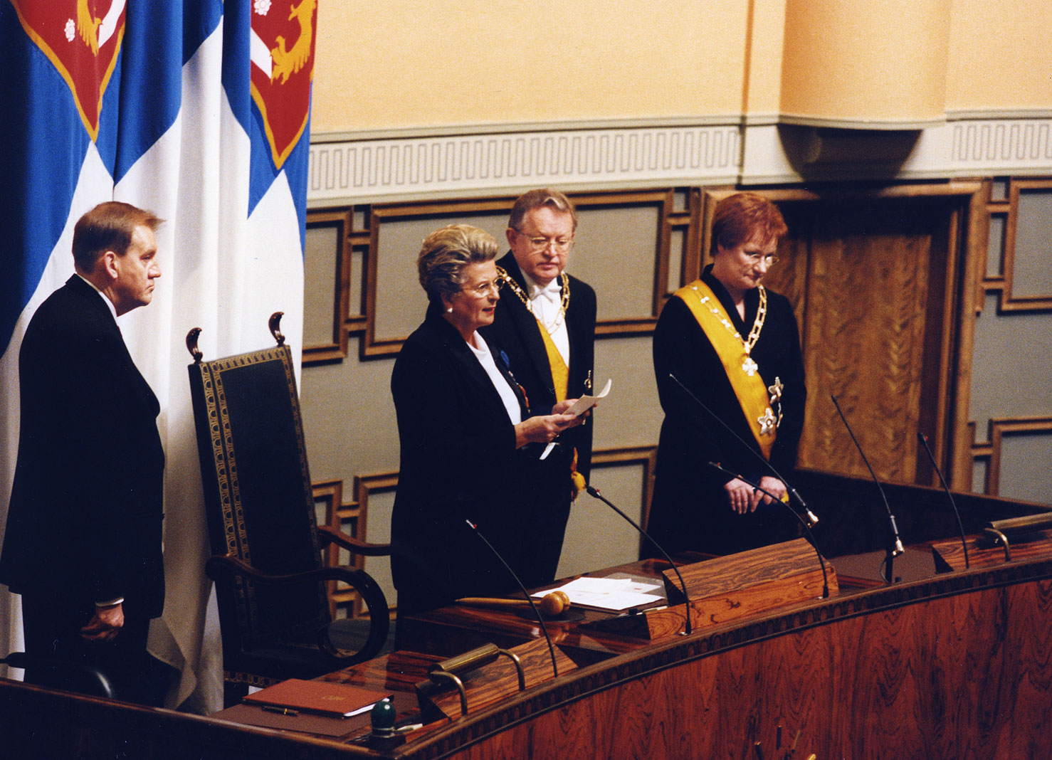 Republikens president Tarja Halonens installation i riksdagens plenisal den 1 mars 2000.
