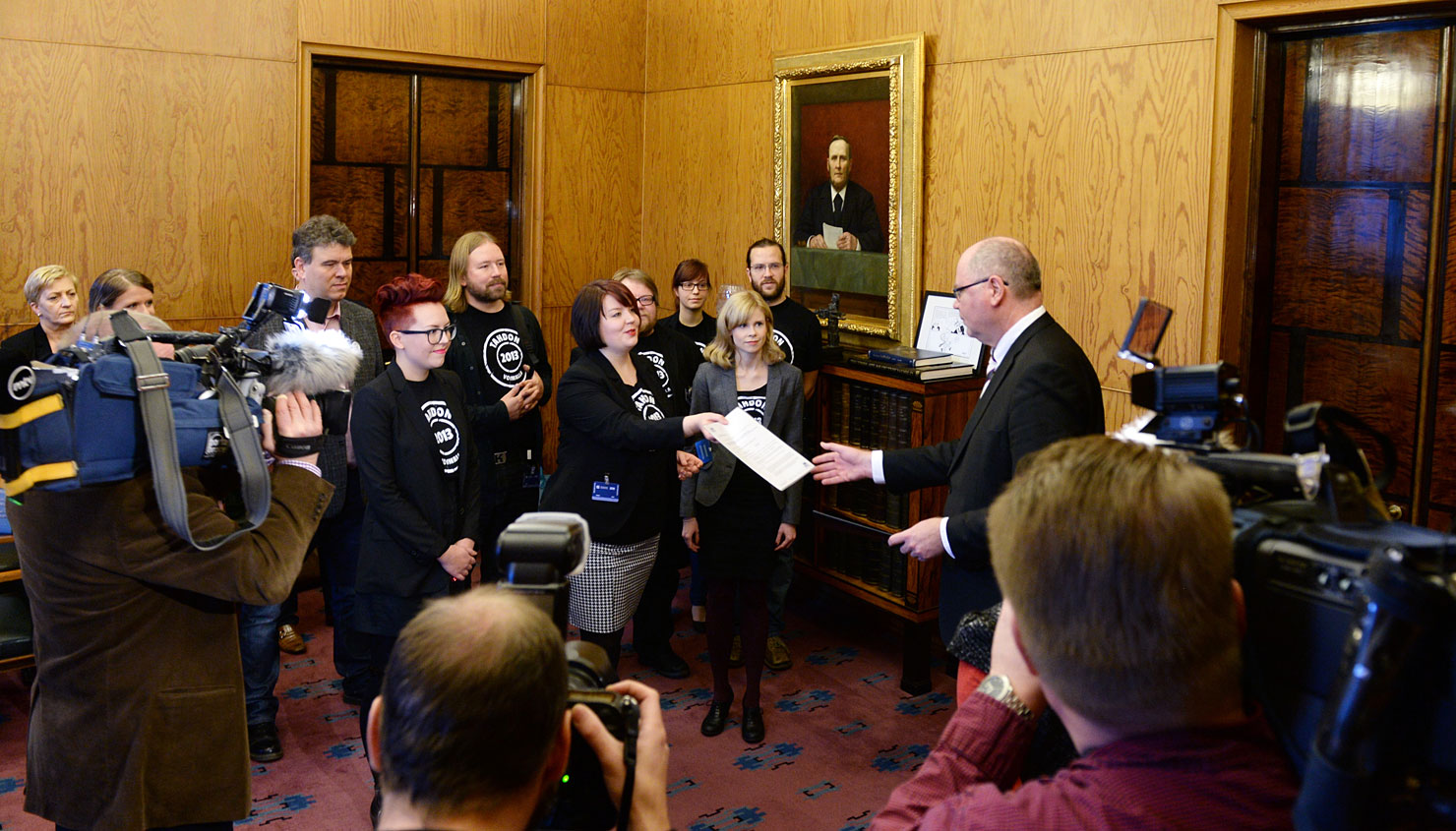 Medborgarinitiativet om ändring av äktenskapslagen, lagen om registrerat partnerskap och lagen om fastställande av transsexuella personers könstillhörighet överlämnas till talman Eero Heinäluoma den 13 december 2013.